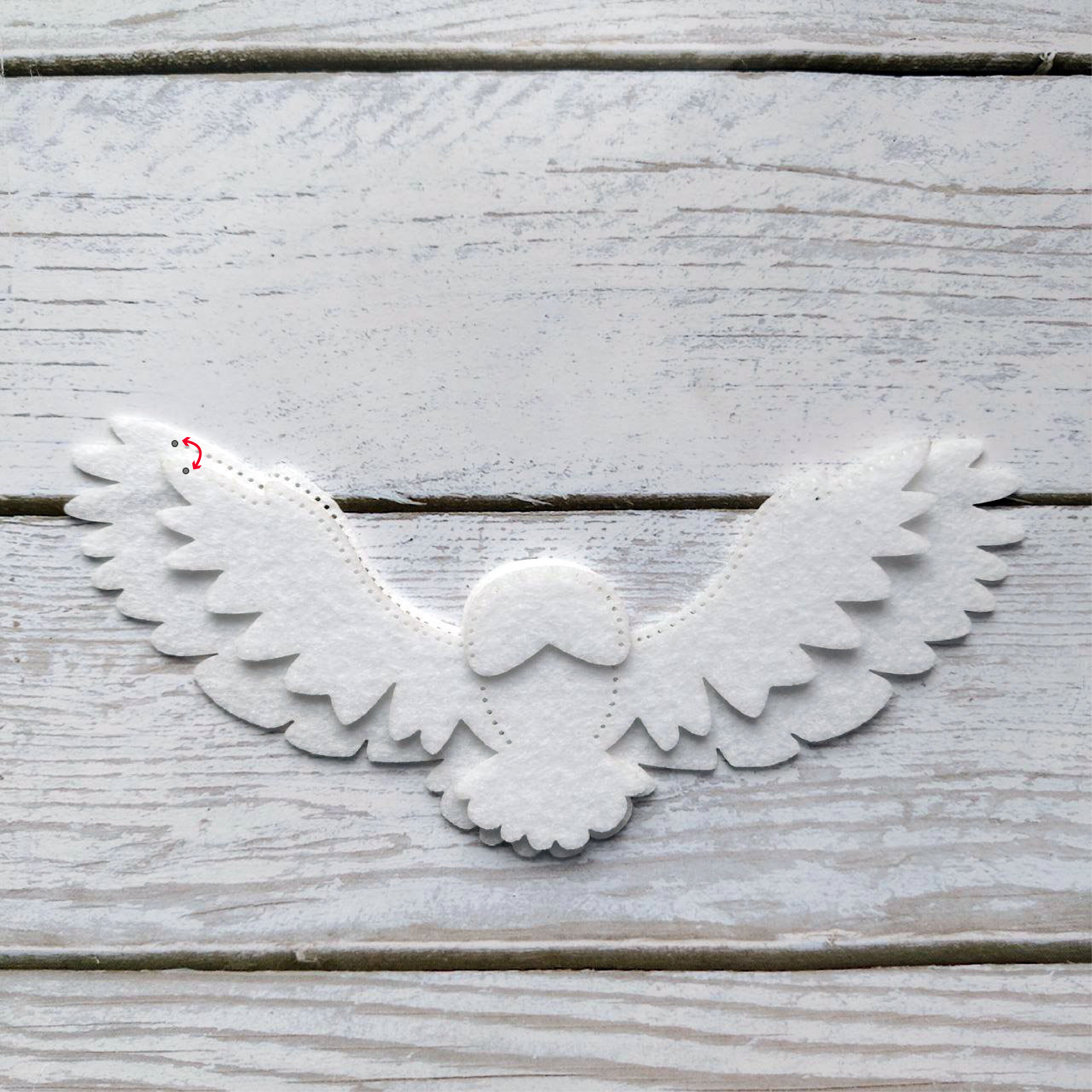 Шнур для петельки (15 см) завяжите узелком. Сшейте две детали крыльев по верхнему краю и тушке. Когда будете сшивать детали на макушке, вставьте  петельку, узелком во внутрь.